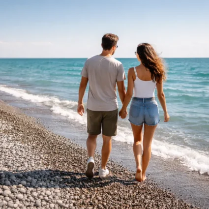 - Галечный пляж с черной галькой. Прогулки босиком по ней заменяют сеанс рефлексотерапии.